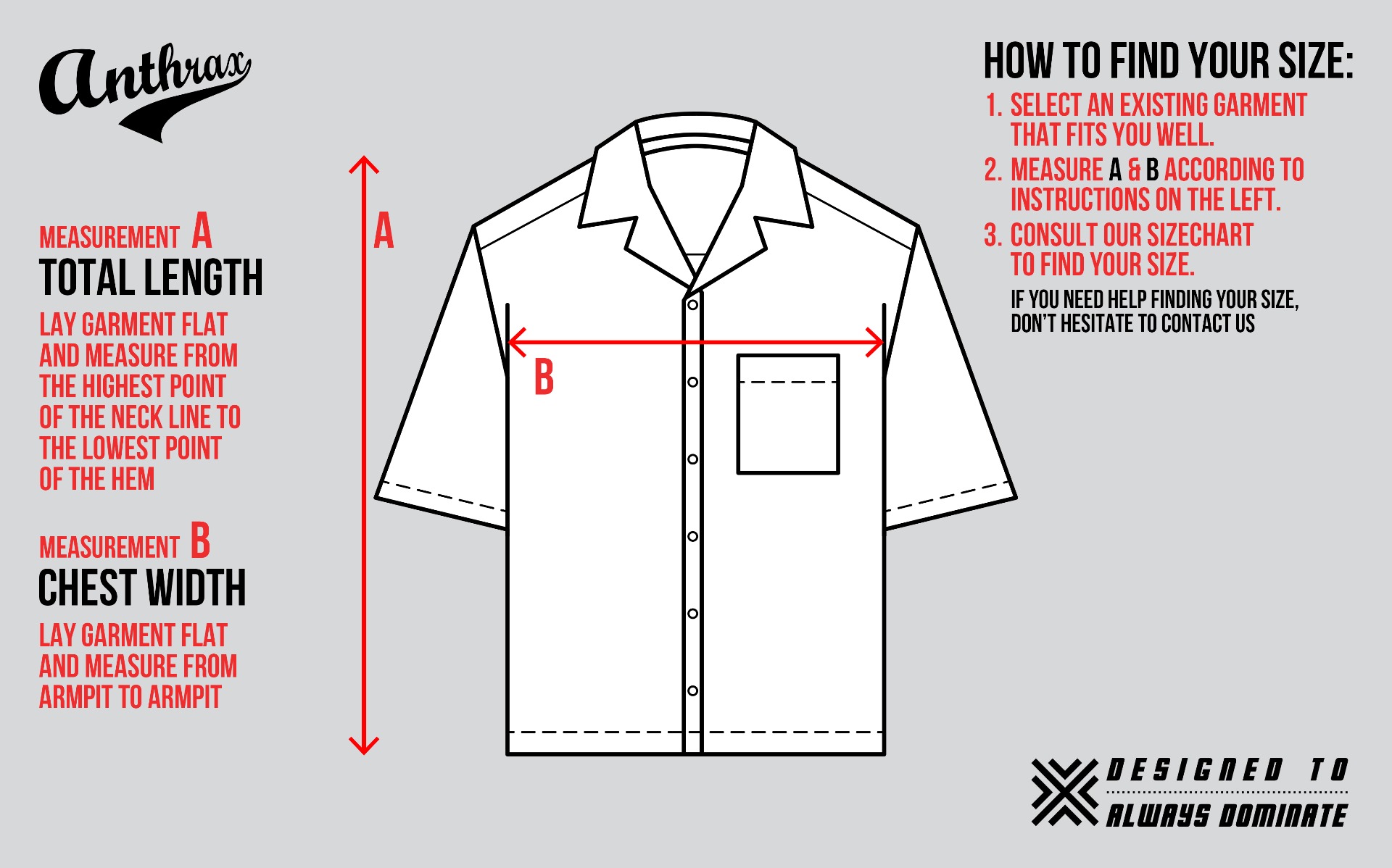 To find out your size, start with a shirt that fits you well. Lay it flat and measure as shown in the diagram below.